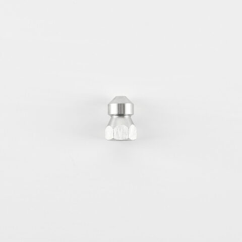 Стандартная пробивная форсунка обтекаемой формы из прочной нержавеющей стали для промывки канализационных труб. Четыре струи назад под углом 25° создают мощную реактивную тягу для самопротягивания форсунки по трубе и одновременной очистки внутренней поверхности трубы от нечистот. Фронтальная струя пробивает плотные засоры.