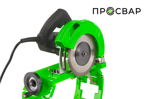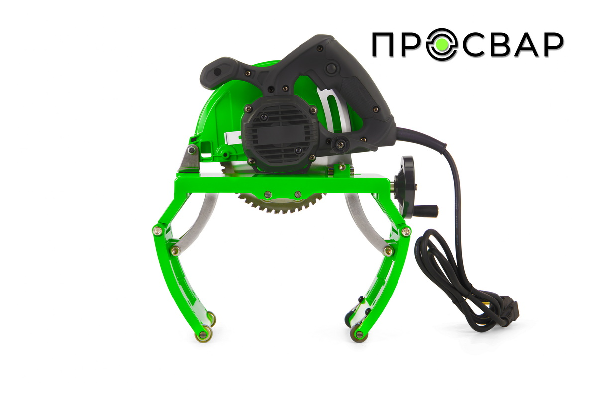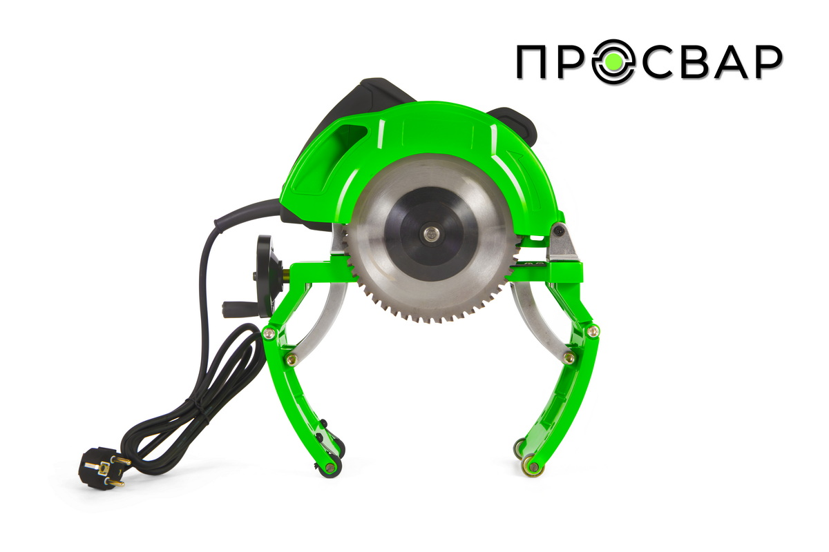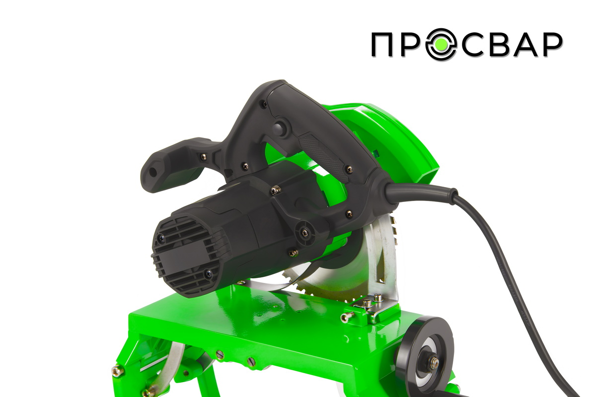 Рама выполнена из профильной трубы с порошковым зеленым покрытием. На ней предусмотрены: ручной винтовой зажим для фиксации трубы по высоте; эргономичная рукоять-рычаг для плавного опускания пилы без ударов; регулируемые опорные ножки с резиновыми накладками для устойчивости на любой поверхности.